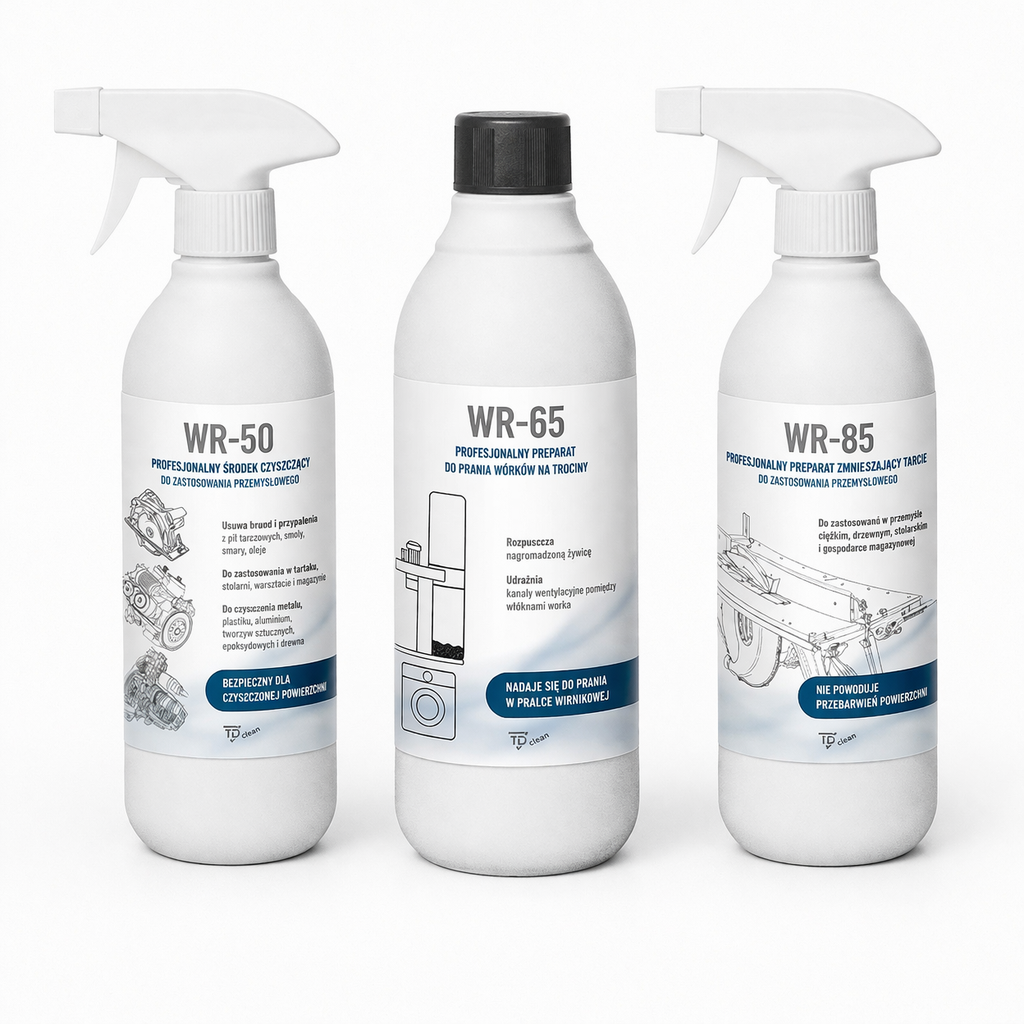 Marka WR oferuje specjalistyczne produkty chemii czyszczącej stworzone z myślą o wymagających użytkownikach z branży budowlanej, przemysłowej oraz przemysłu drzewnego. Nasze rozwiązania skutecznie usuwają najtrudniejsze zabrudzenia pochodzenia ropopochodnego, żywicznego oraz inne zanieczyszczenia technologiczne, które powstają w trakcie intensywnej eksploatacji maszyn, narzędzi i powierzchni roboczych. Produkty WR łączą wysoką efektywność działania z bezpieczeństwem użytkowania, zapewniając niezawodność w warunkach profesjonalnych.